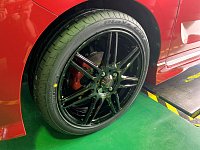こちらも先日スタッフ日記でご紹介させて頂いたホイールセットです(*^^) 赤と黒のボディーカラーでしたのでホイールもブラックに近いタイプを選んで頂きました。 とてもいい感じになりお客様にも喜んで頂けました。 最後にアライメントもさせて頂き安定感もバッチリ!! 高速でも下道でも快適に運転...