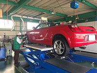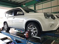大好評のアライメント調整!(^^)! 本日はカーディーラー様からのご依頼で、作業中です。 エクストレイルはフロントのトゥ角だけでなく、リアも調整できる高性能な足廻り♪ SUV車で大人気車種☆ 乗っている方も多いかと思いますが、タイヤ交換時には是非アライメント調整を(^^♪
