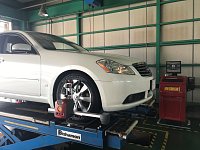 カーディーラー様からのご紹介で日産フーガにアライメント調整♪ 足廻り部品の交換後に作業をご依頼(^^♪ しっかり基準値に調整させていただきましたのでご安心を★ 事前にご予約いただいていた作業でしたので、スムーズに完了♪