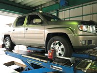 車屋さんのご紹介でホンダ逆輸入車のリッジラインをアライメント調整♪ 当店が使用しているアライメントテスターにしっかり基準値データが登録されていましたので、 順調に作業させていただきました(^^♪ 国産車に比べ車体がとにかくデカイ!! リフトの幅もギリギリでした(*_*;