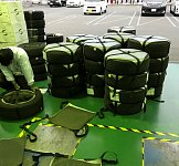 タイヤ保管サービスをご利用いただいているお客様のタイヤを梱包中です(^_^)v お客様の大切なホイールに傷がつかないようスポンジ使って、丁寧に取り扱っています。