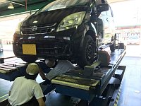 本日も大好評!!アライメント調整中です(^_^)v 軽自動車からコンパクトカー、ミニバンやセダンなどお任せください! 街乗りで使用している方でも数万キロ走行すれば、基準値からズレてしまいます・・・。 タイヤを長持ちさせ、性能を引き出す為には大切な作業ですね☆ ※後輩の水野君に指導中です(^O^)