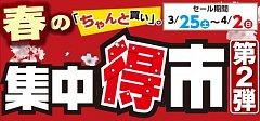 3/25~4/2 春の集中得市 第2弾を開催いたします。 期間中にタイヤ4本ご購入の方には豪華景品をプレゼント☆ ついでにオイルやバッテリーなども交換がお値打ちに!! スタッフ一同心よりお待ちしております。