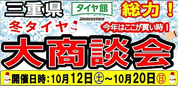 津市 鈴鹿市 亀山市 松阪市 HPご覧の皆様、 こんにちは、タイヤ館 津店です! 冬タイヤ大商談会開催中!! 去年の暖冬の影響もあり 今年はお買い得スタッドレスを 多数ご準備しております! 10月20日まで!! 是非この機会に!! さらに!!! 大抽選会で スタッドレスクーポンが当たる キャンペー...