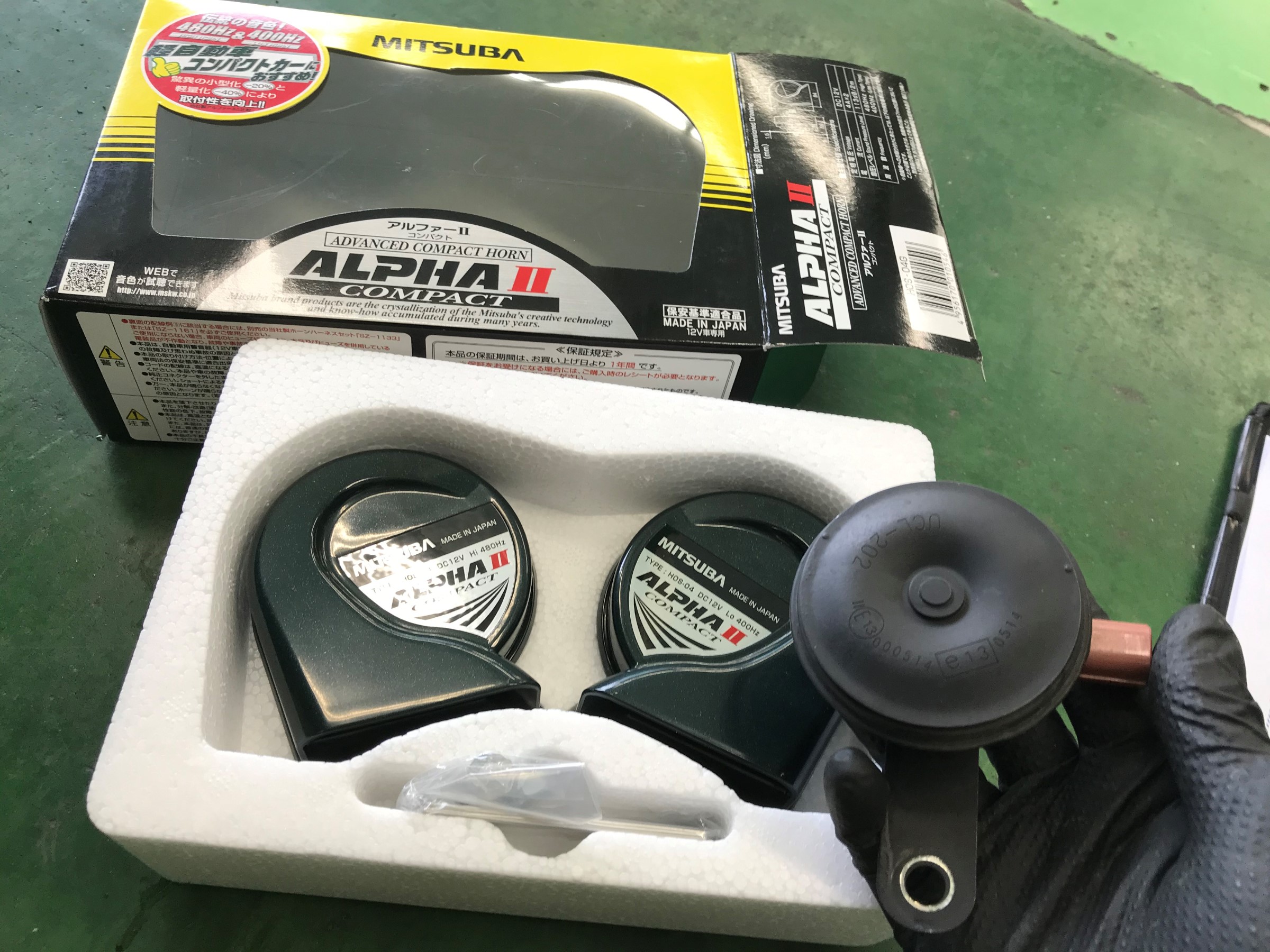 純正は1個だけのシングルタイプですが、アルファⅡコンパクトは480Hzと400Hzのダブルタイプ。