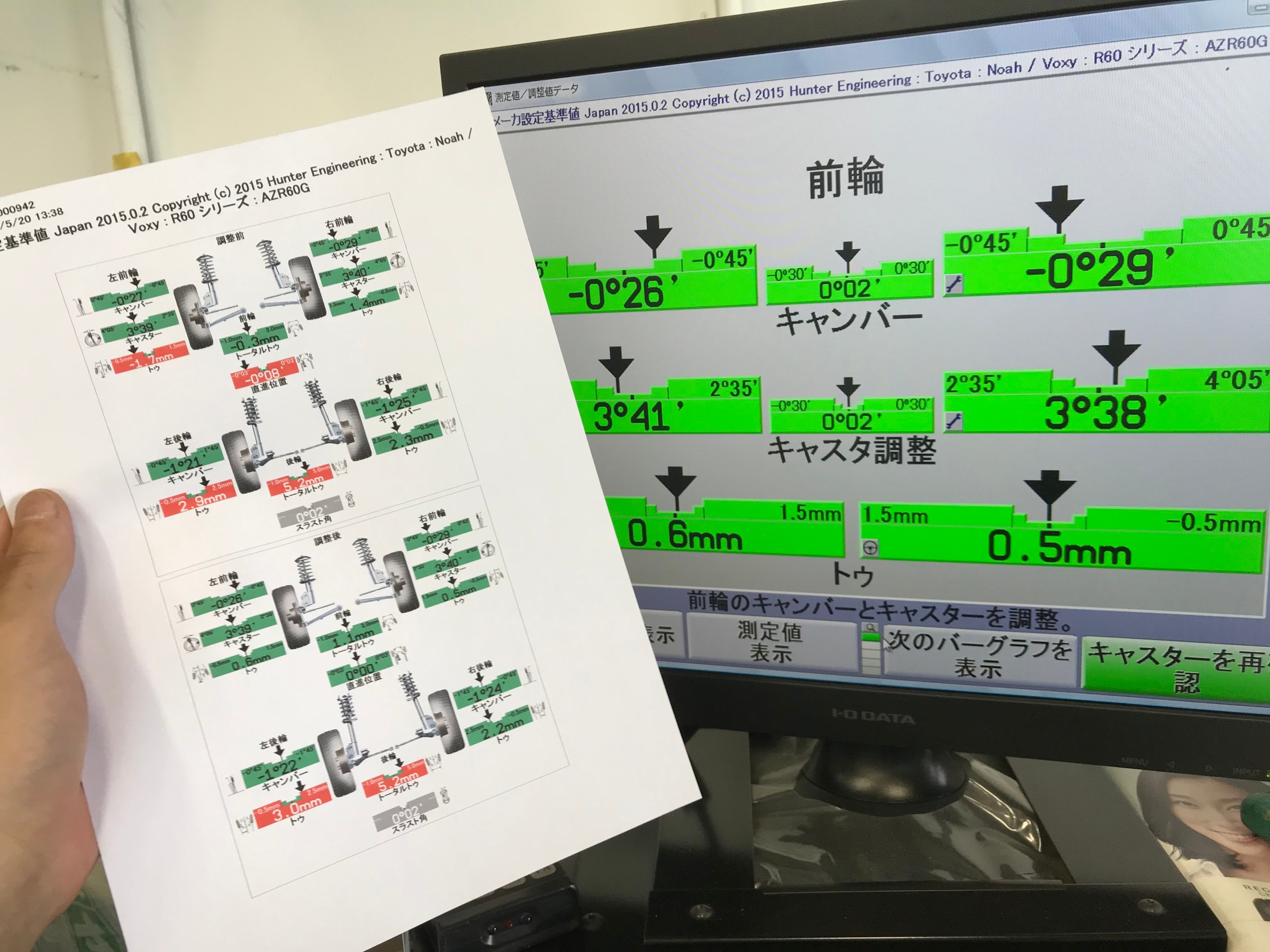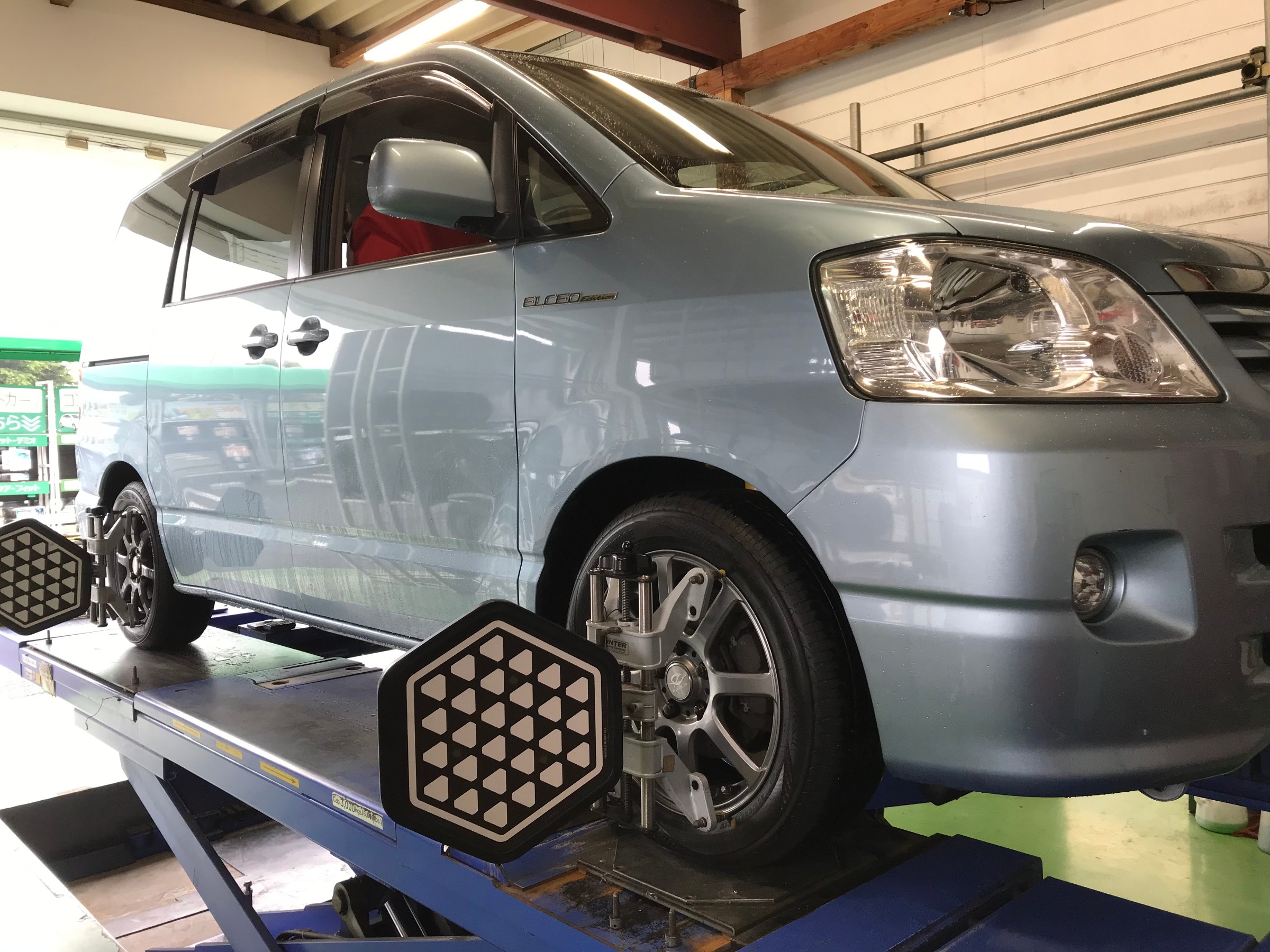 装着後には、アライメント調整でずれてしまったタイヤの角度をしっかり補正しました。