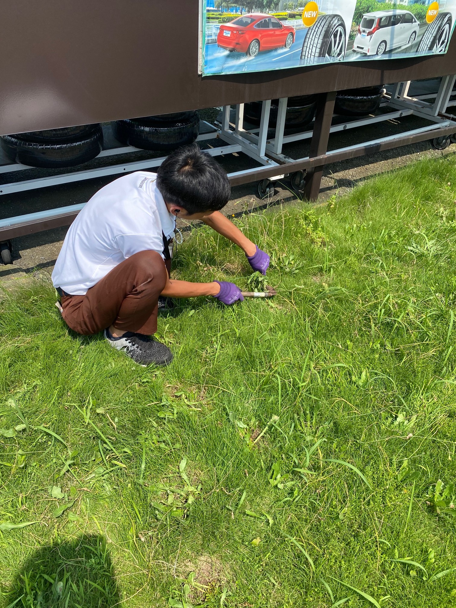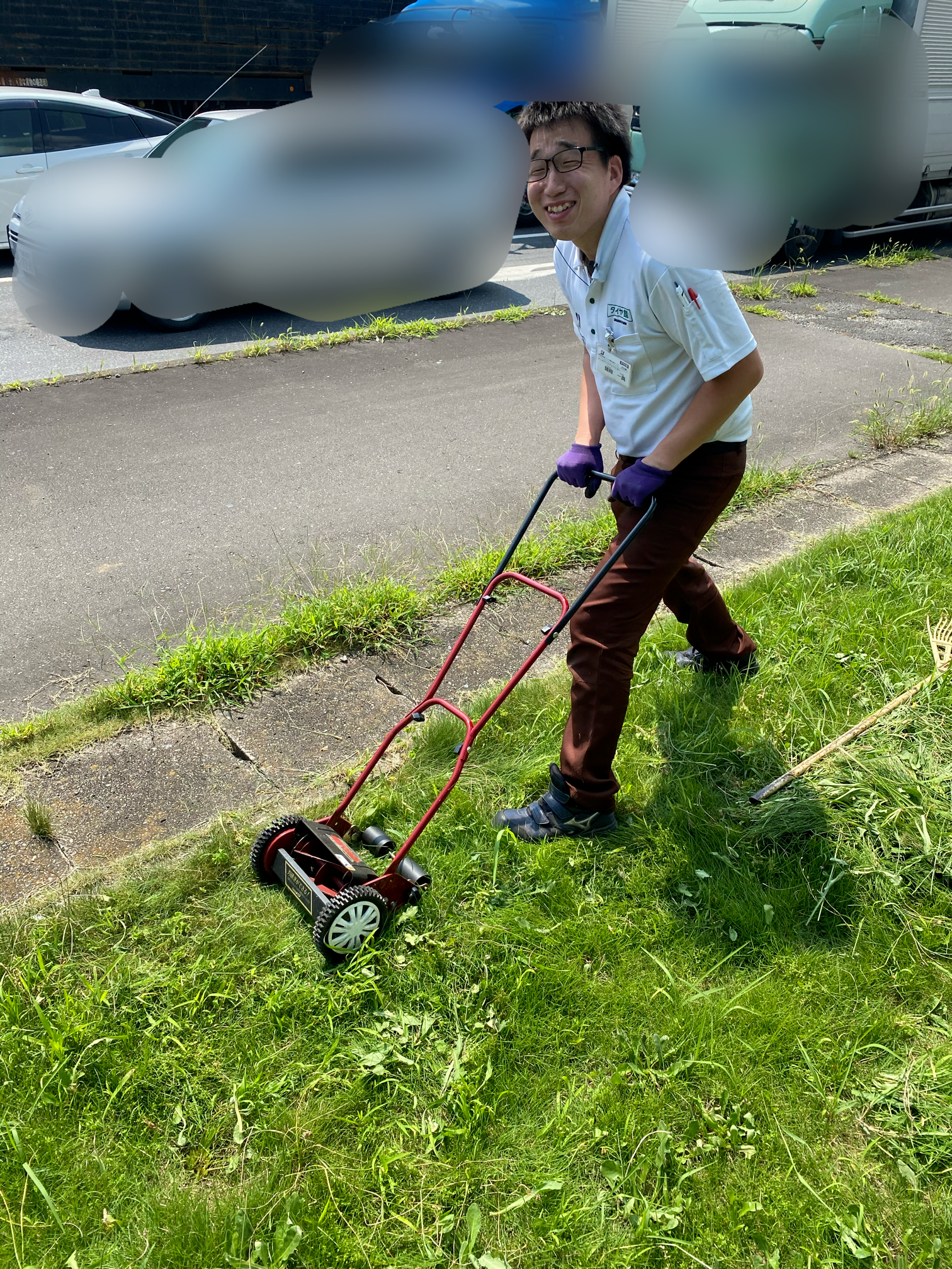 8月に入り暑い日が続きますが、先日お店の前の芝刈りを行いました!!
