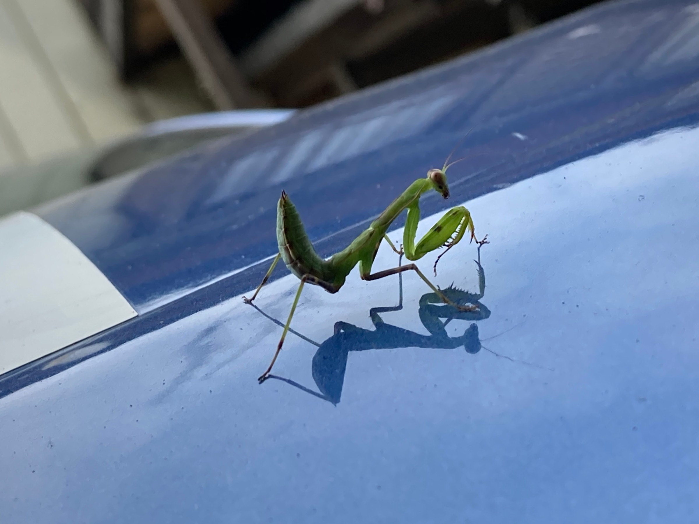 そんななか、ふと見るとボンネットの上にカマキリが・・・