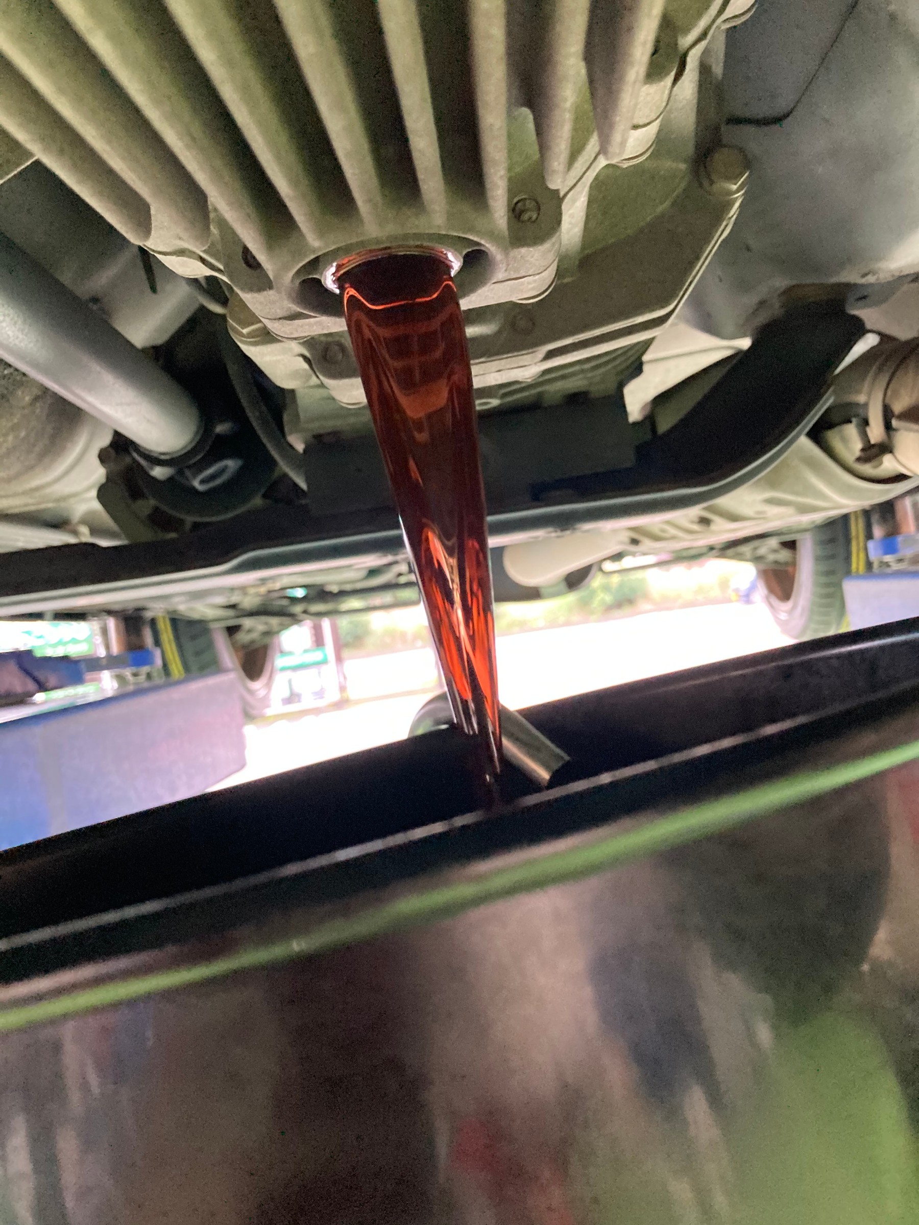 なるほど、抜き取った廃油を見てみると、確かによくあるミッションオイルとは違う赤色ですね・・・。