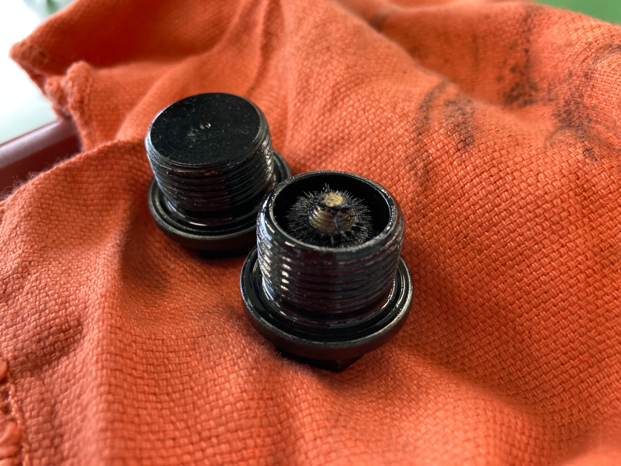 外したドレンボルトを見てみると、磁石にだいぶ鉄粉が付いていました。