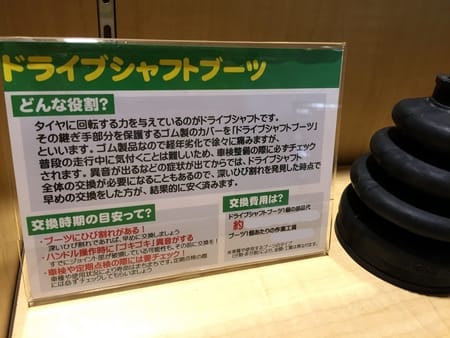 さて、本来は新しいタイヤへの交換作業で入庫したのですが、タイヤを外してみるとビックリ。ドライブシャフトブーツに深い亀裂が入ってしまっています。