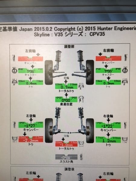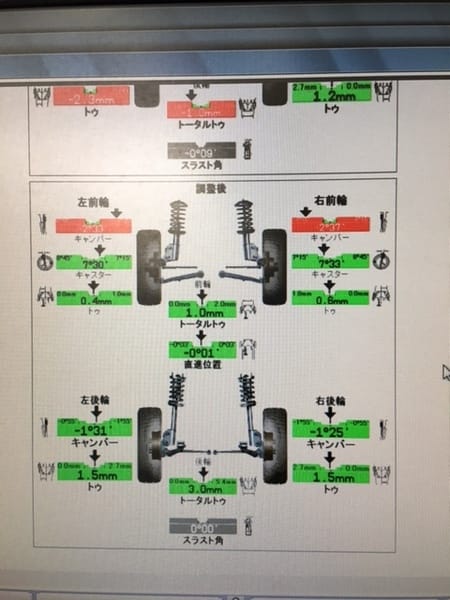 苦戦しながらなんとか調整完了したのが2枚目の画像です!まだ赤い要調整箇所は残っていますが、実はこの車では直せない部分なので諦めるしかありませんでした。とにかく四輪とも基準値のほぼ真ん中に調整できたので満足しています!!