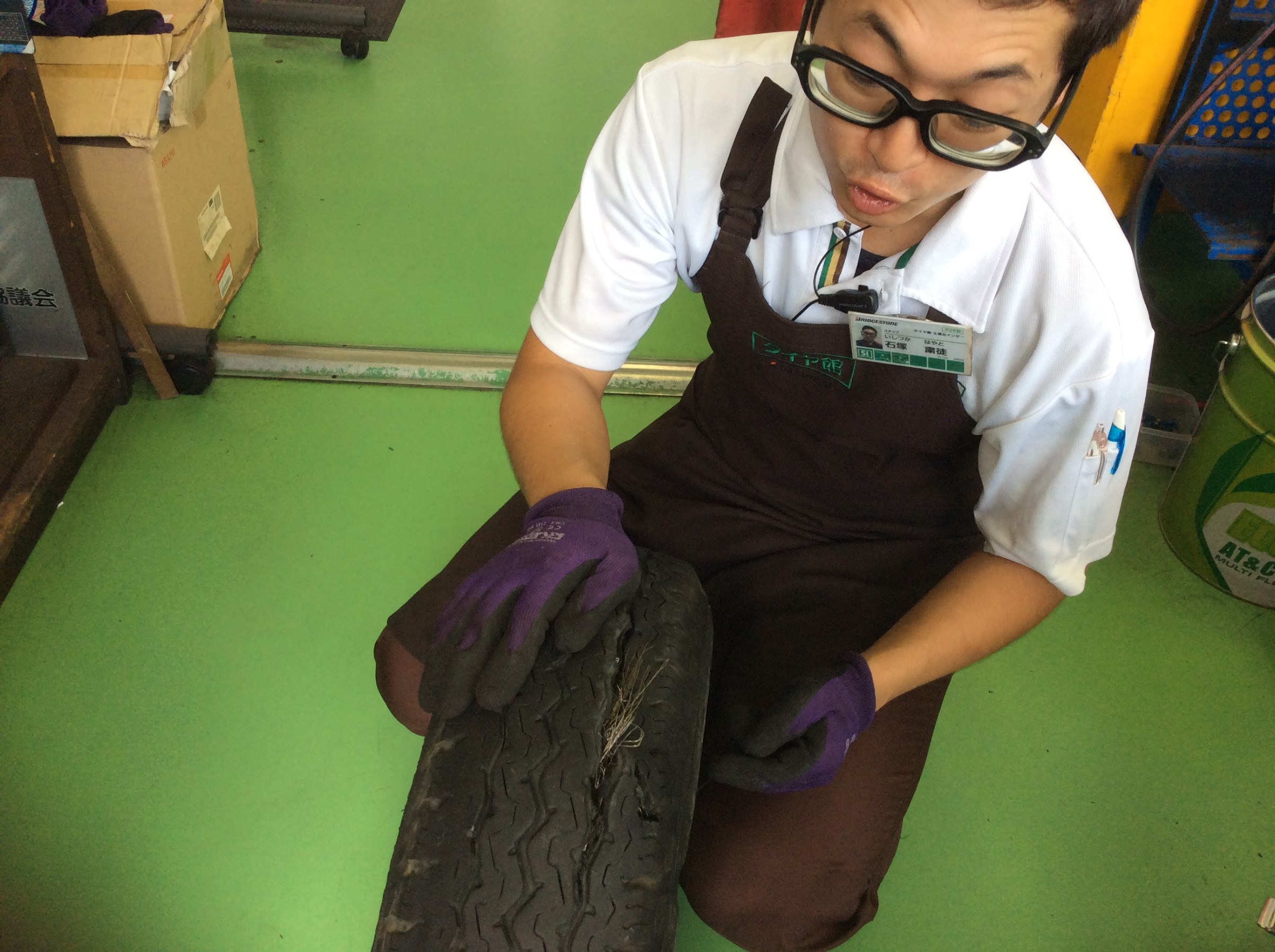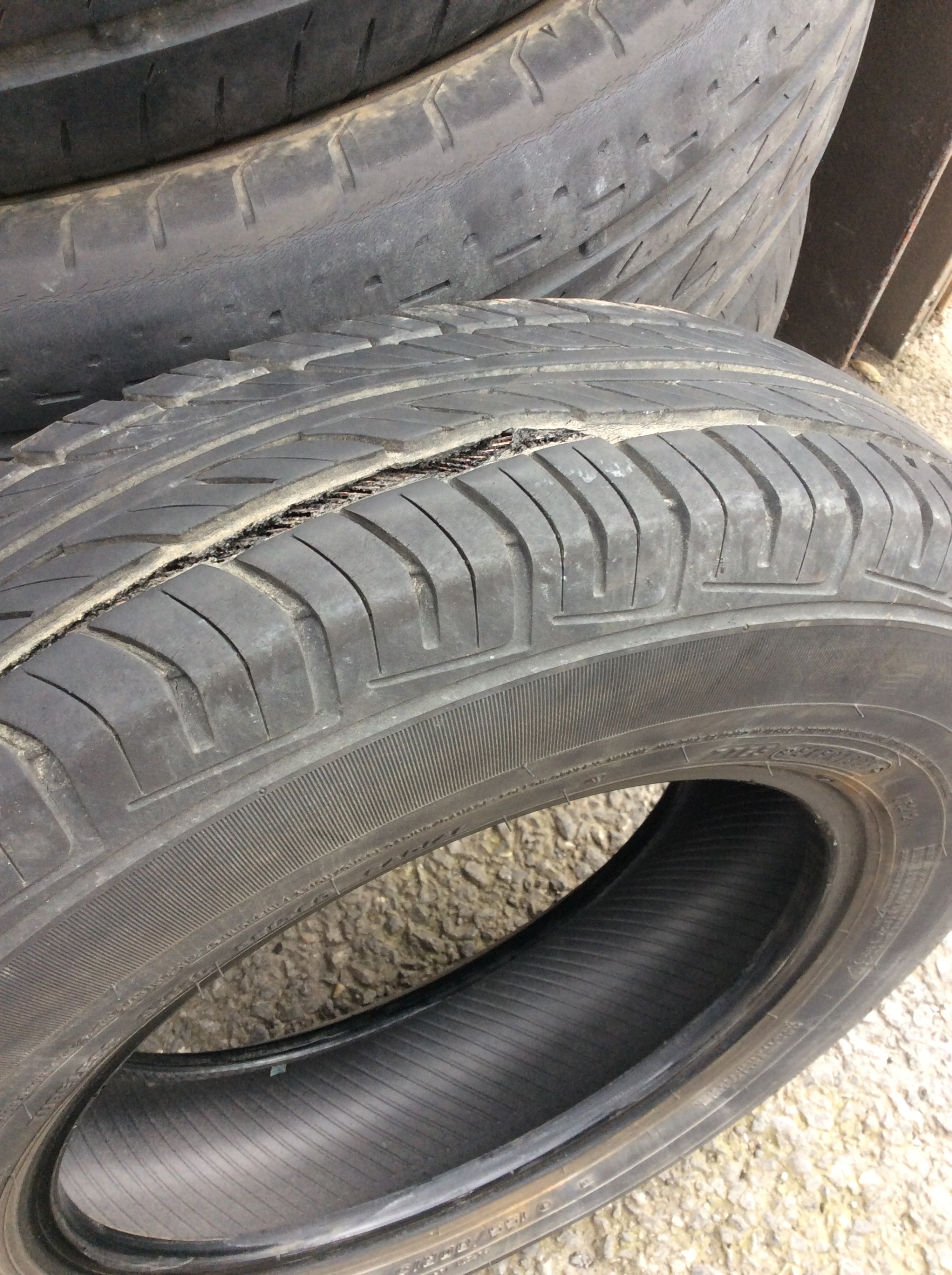 このタイヤをご覧ください!これはトラック用のタイヤなのですが、接地面が裂けてしまって内部のワイヤーが出ていますね!自分もこの仕事をしていて色々なタイヤを見てきましたが、このようなケースはなかなか珍しいです。