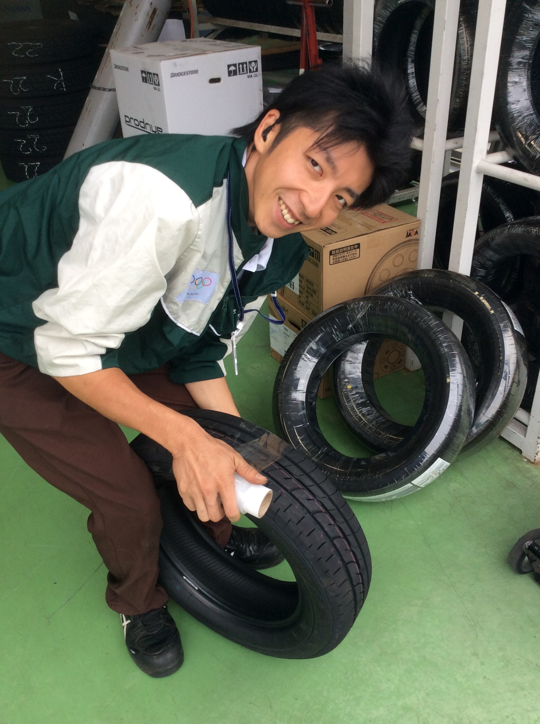 こちらはタイヤにラップを巻いている西中スタッフです。