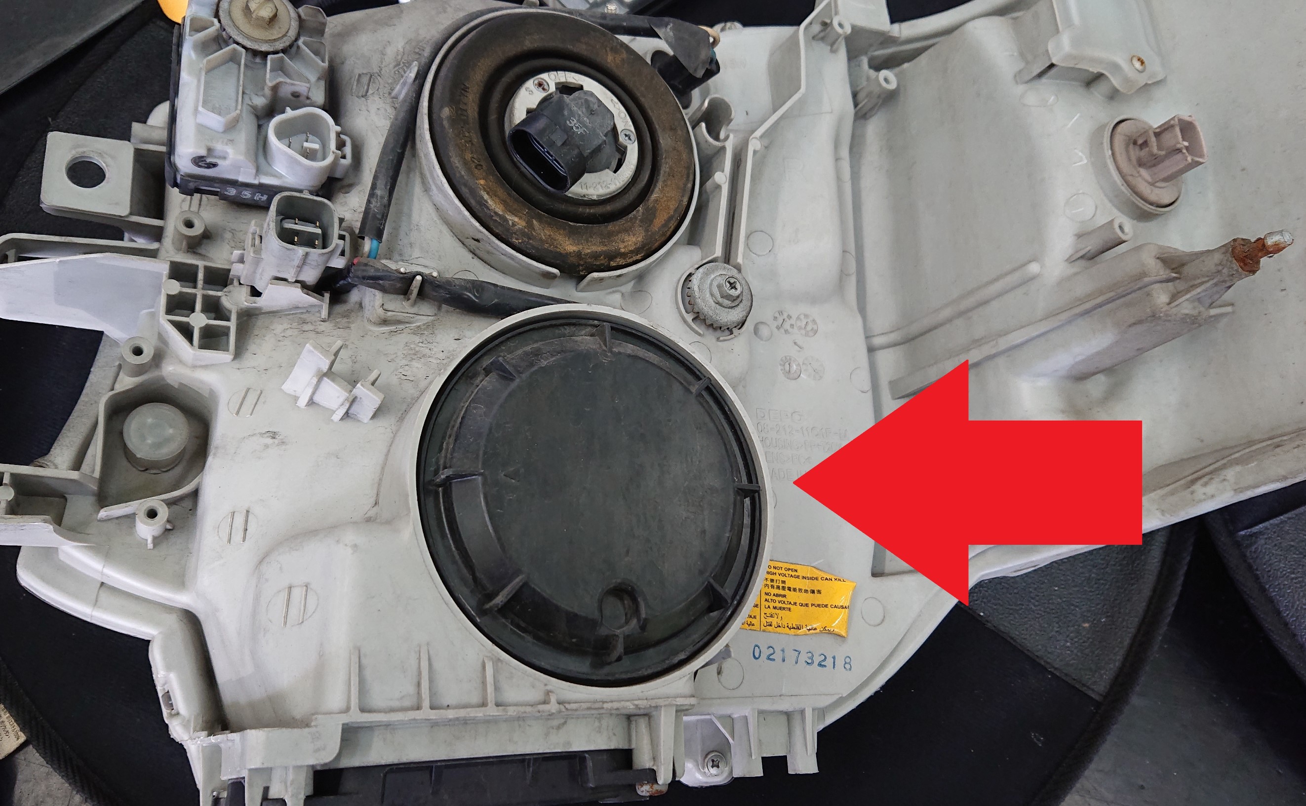 取り外したヘッドライトの本体裏側のカバーを外し、使用していたヘッドライト・バルブを取り外してから・・・