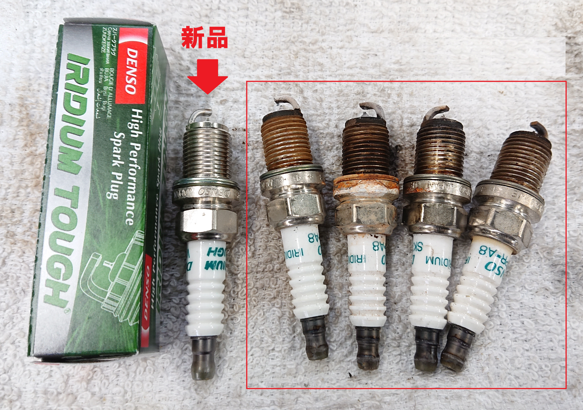右側の取り外した『スパークプラグ』ですが・・・長年のご使用で、中心電極と接地電極の電気摩耗が発生してしまっていました。
