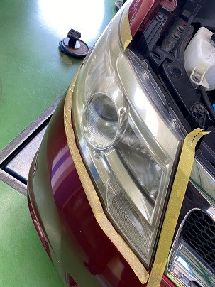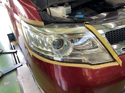 ヘッドライトのコーティング前に磨いて下地処理をします。