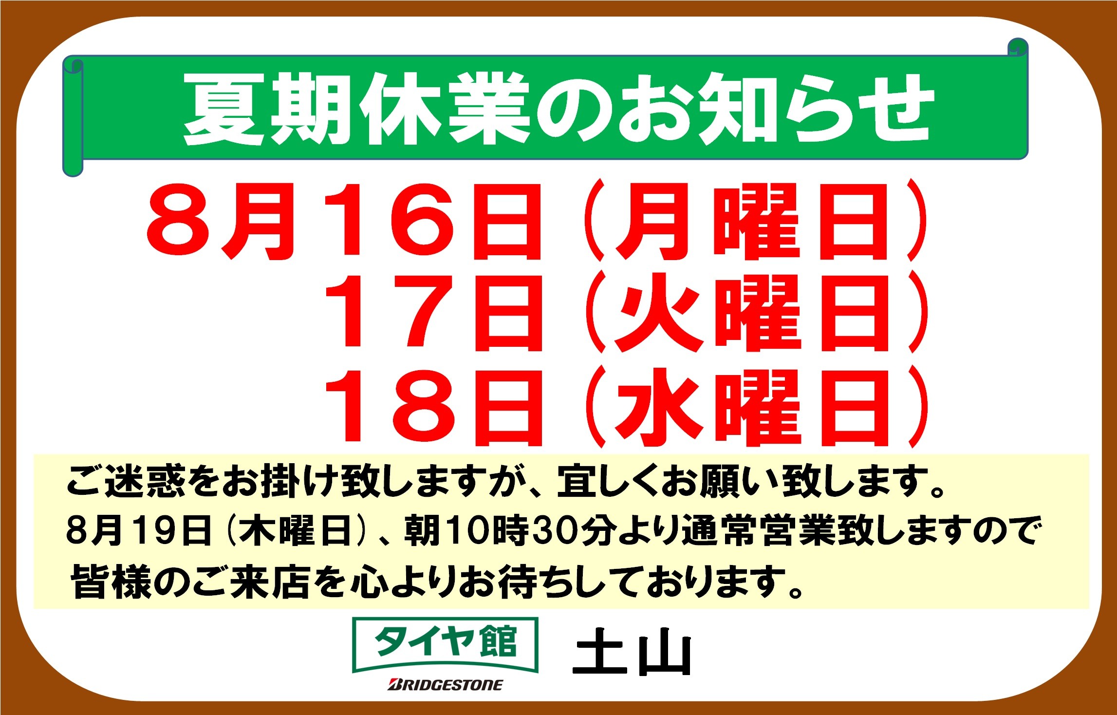 8月19日(木曜日)朝10時30分より通常営業致しますので、皆様のご来店をお待ちしております。