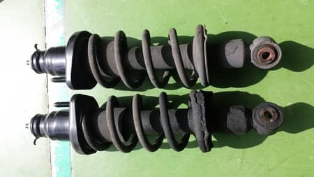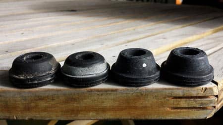 写真はリヤの足廻りのブッシュですが、高さが全然チガイマス。新旧比較です。もちろん右ふたつが新品です!