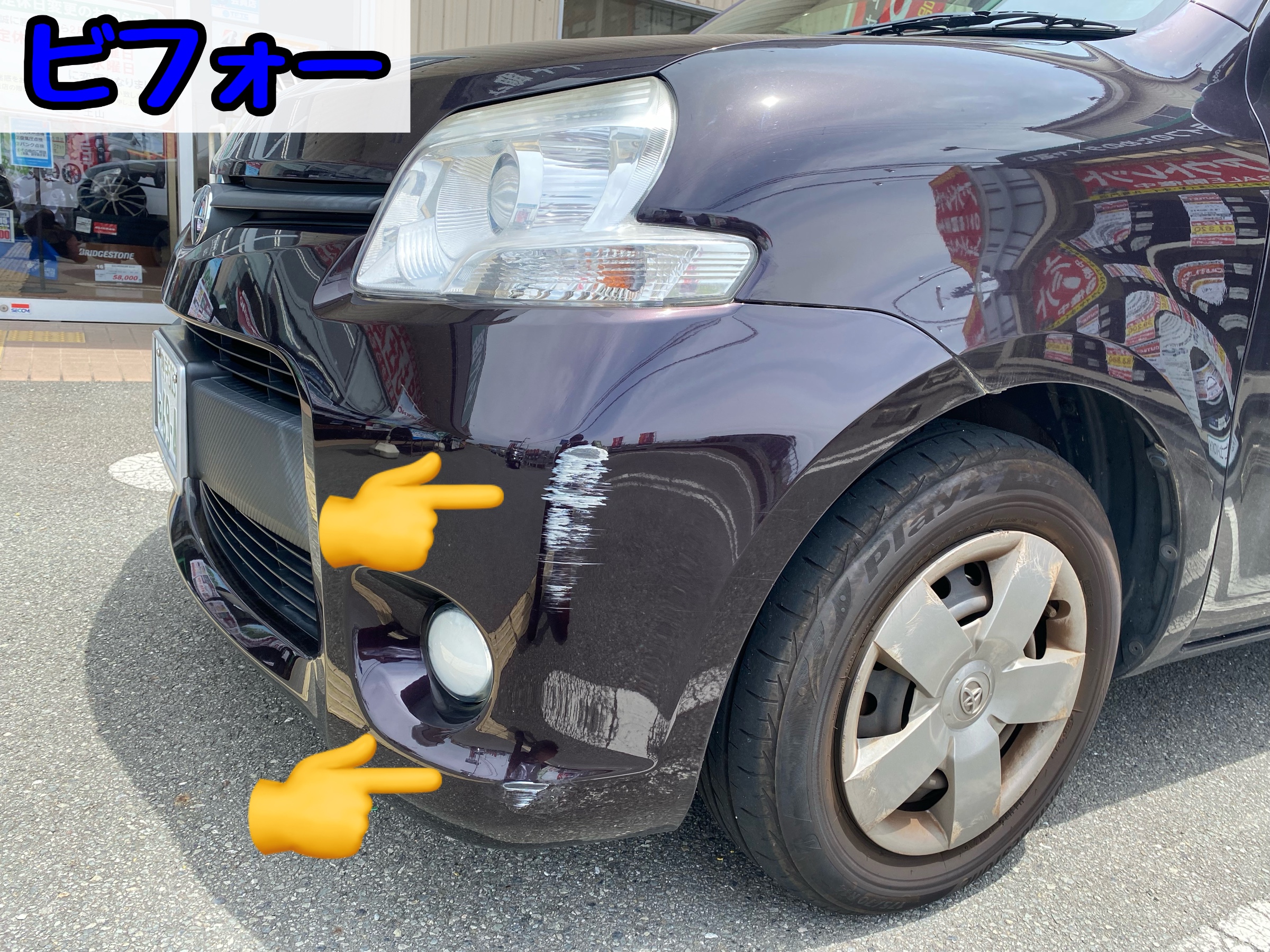 左側バンパー部分の塗装が2箇所剥がれており、