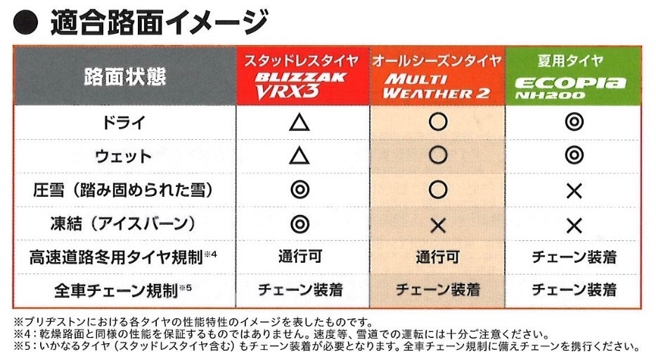※マルチウェザーはスタッドレスタイヤではないため、凍った路面は走行できません。