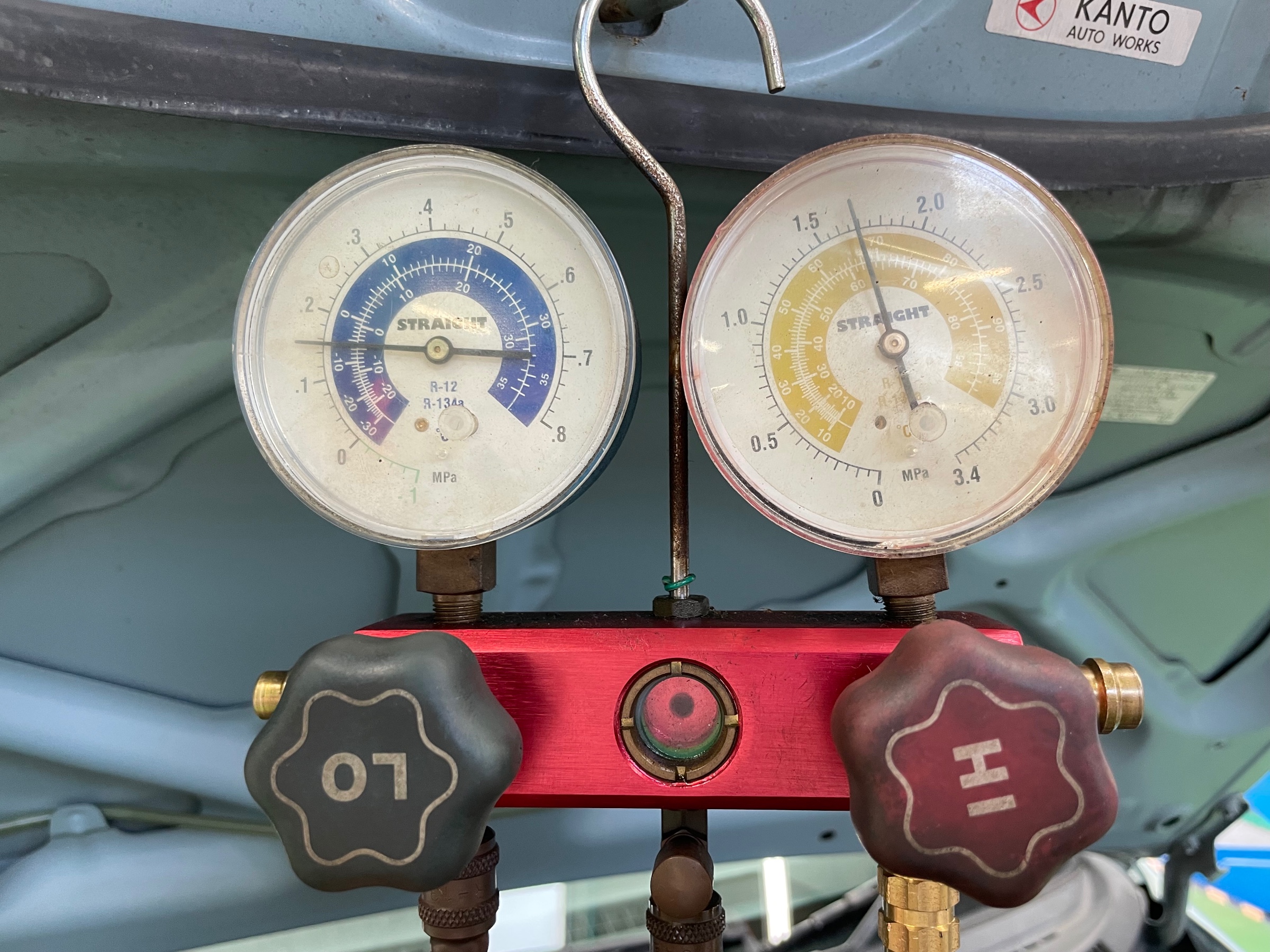 エアコンの配管上にある低圧側バルブと高圧側バルブにエアコンマニホールドゲージを接続し測定スタート!