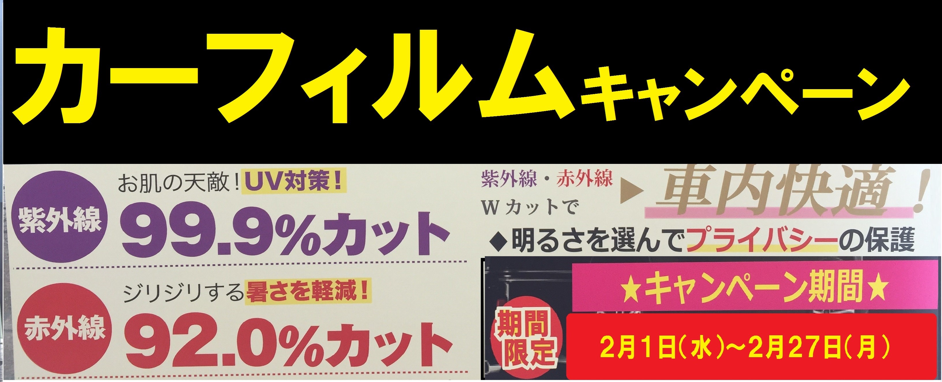 ★カーフィルムキャンペーン実施します(^o^)/★ ポスト 2017年1月30日 2月1日(水)~27日(月)の期間で、『カーフィルムキャンペーン』を実施します(^o^)/期間中は、フィルム施工料がお買い得価格に!カーフィルムというと、スモークで窓を黒くするイメージが 強いですが、それ以外にもUVカット(日焼け防止)や赤外線カット(断熱)などいろいろなタイプがありますので、ぜひこの機会にご相談ください。※今回のキャンペーンは国産車(レクサス除く)に限らせて頂きます。 カテゴリ:お知らせ