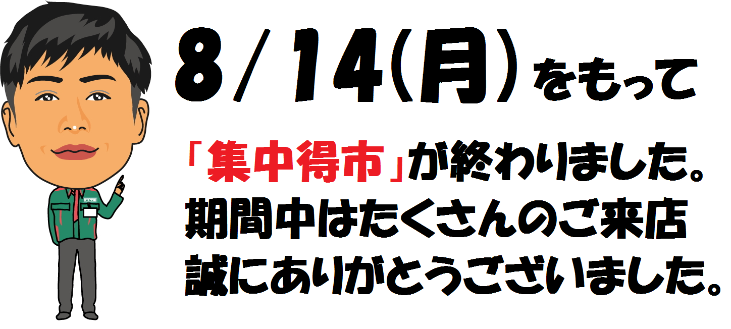 ありがとうございました! ポスト 2017年8月13日 8月14日(月)をもって『集中得市』は終了となりました。 同時にエアコン冷え冷えキャンペーンも終了となります。 セール期間中はたくさんのご来店ありがとうございました!! たくさんのお客様にご来店いただき、おかげ様で大盛況となりました。 また、期間中は作業待ちのお時間も発生しお客様に ご迷惑をお掛けしました事をお詫び申しあげます。 キャンペーンは終了しましたが、 まだまだ暑いのでエアコンの点検等は、遠慮なくお申し付けくださいね(^^♪ カテゴリ:お知らせ