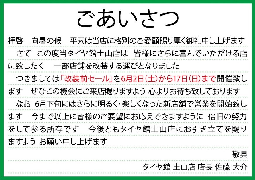 重大告知! タイヤ館土山をご利用いただいているお客様へ!!