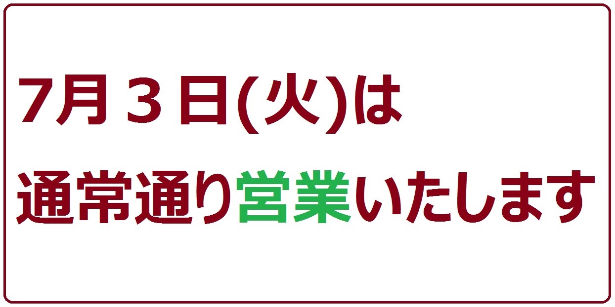 営業のお知らせ ポスト 2018年6月29日 7月3日(火)は『リニューアルオープンイベント』開催中につき 通常通り営業いたします。 みなさまのご来店、スタッフ一同心よりお待ちしております カテゴリ:お知らせ