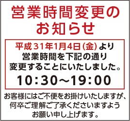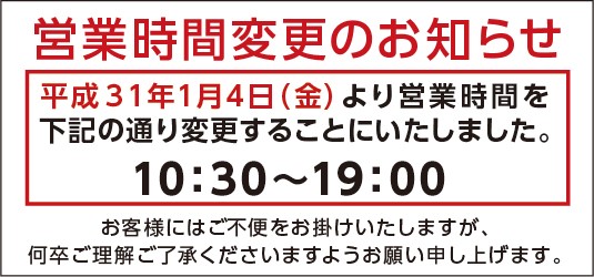 営業時間変更のご案内 ポスト 2018年12月27日 2019年より営業時間が変更となります。 AM10:00-PM7:00 (従来) AM10:30-PM7:00 (2019年1月4日より) 大変ご迷惑をお掛け致しますが、何卒宜しくお願い致します。 カテゴリ:お知らせ