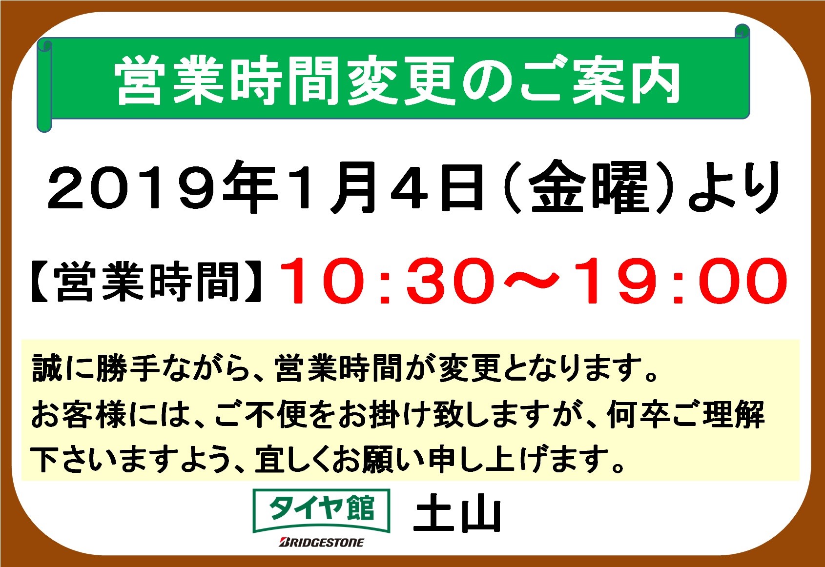 ◇営業時間変更のお知らせ◇ ポスト 2019年5月20日 いつも、タイヤ館 土山をご利用いただき、誠にありがとうございます。 誠に勝手ながら、2019年1月4日より営業時間が変更となっておりますので、下記の通りご案内申し上げます。 お客様には、ご不便をお掛け致しますが、何卒ご理解ご協力くださいますようお願い申し上げます。 【変更前の営業時間】 10時~19時 【変更後の営業時間】 10時30分~19時 カテゴリ:お知らせ