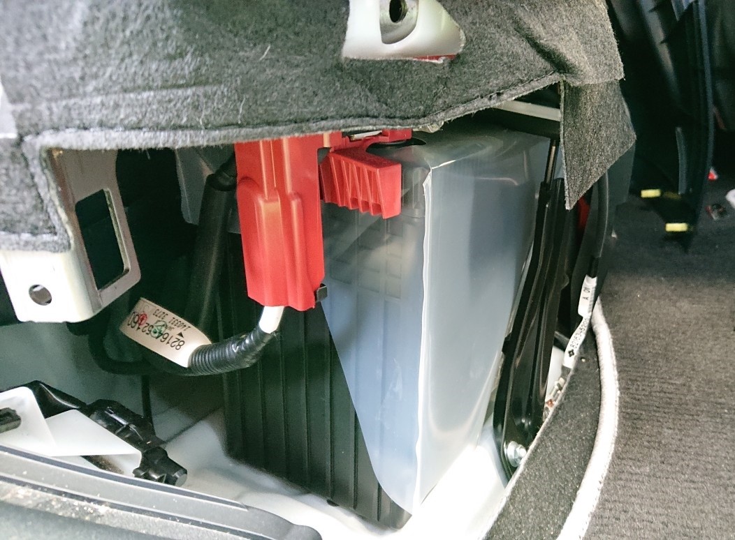 足元のカバーを取り外すと『補機用バッテリー』が見えてきます。
