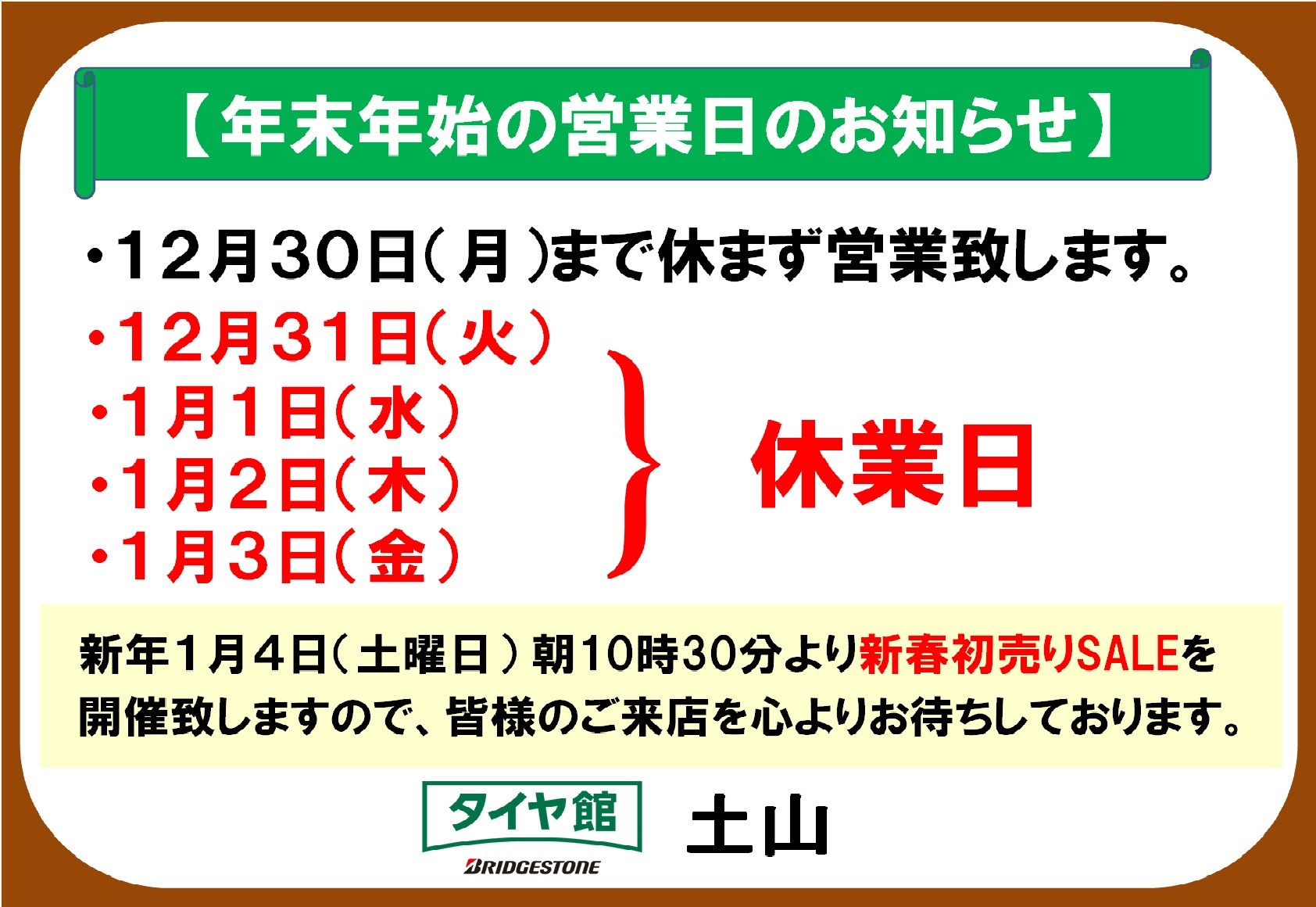 なお、新年は1月4日(土曜)から『新春 初売りSALE』をさせていただきますので、皆様のご来店を心よりお待ちしております。