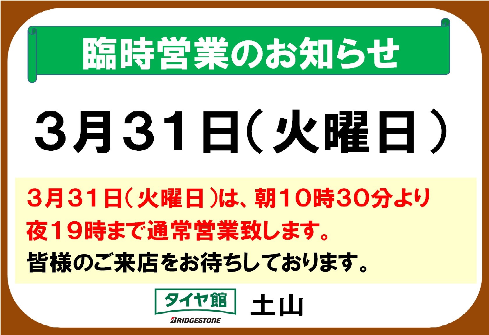 3月31日(火曜日)は通常営業致します。 ポスト 2020年3月12日 いつも、タイヤ館 土山をご利用いただき、またホームページをご覧いただき、誠にありがとうございます。 ~臨時営業のお知らせ~ 3月31日(火曜日)は、朝10時30分より通常営業致します。 皆様のご来店を心よりお待ちしております。 カテゴリ:お知らせ