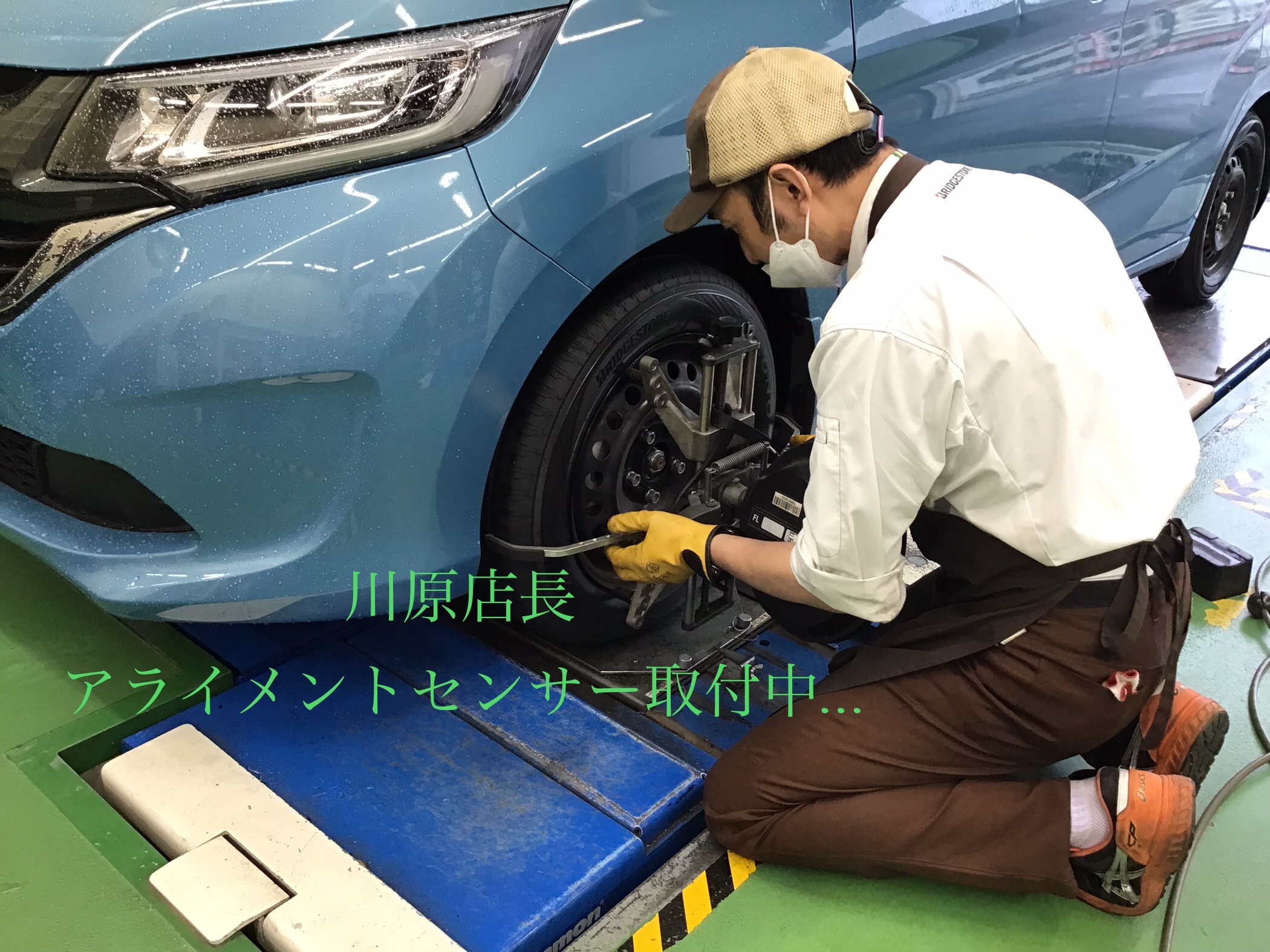 タイヤの空気圧を調整した後にタイヤの角度を測定するセンサーを付けていきます。