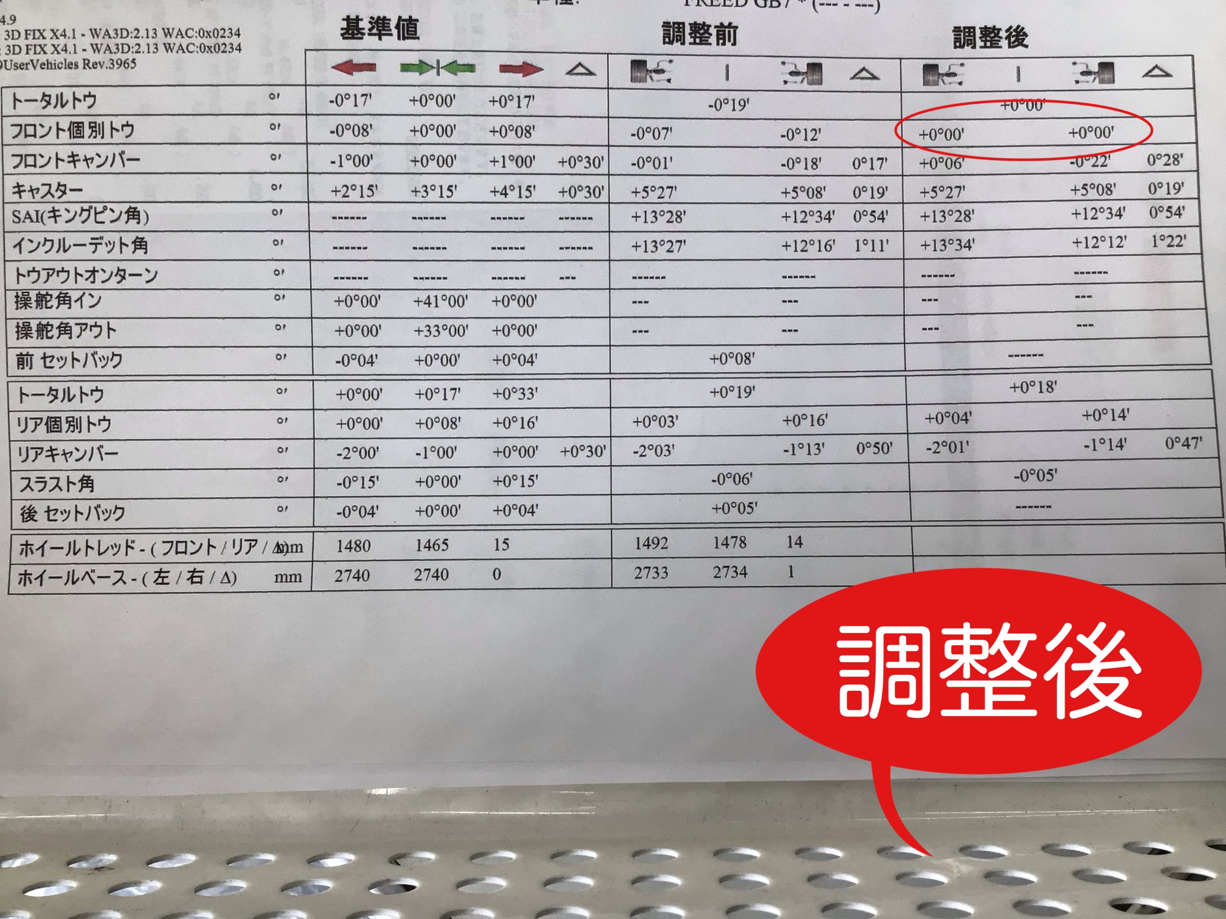 調整後で、左前:0°00 右前:0°00 に直されました。