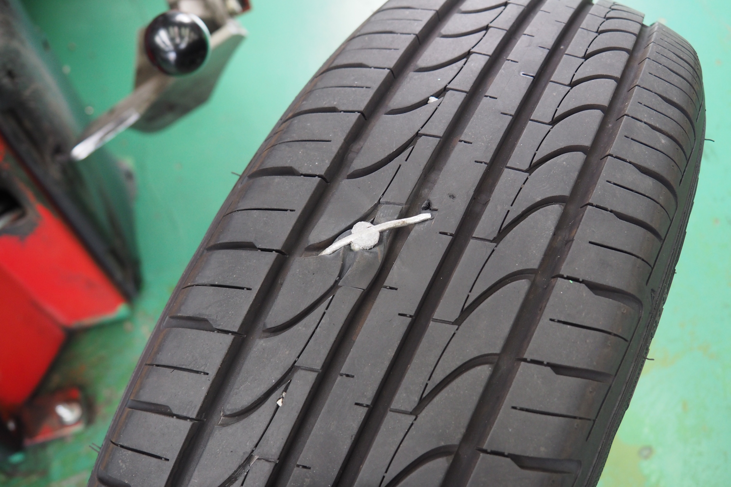 だいぶ太い杭?みたいのが刺さっていたので、修理は難しいのでタイヤ交換させてもらいました。