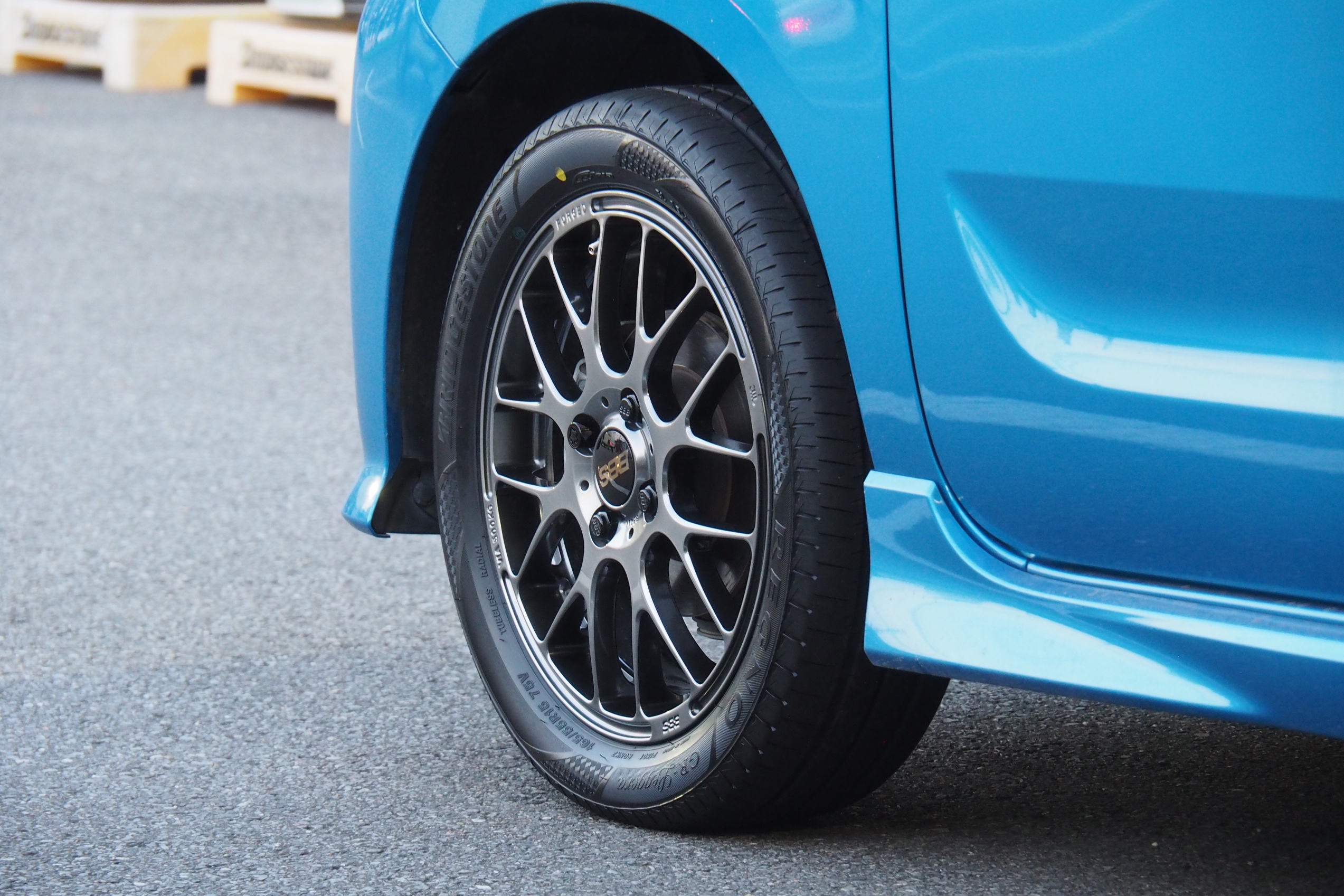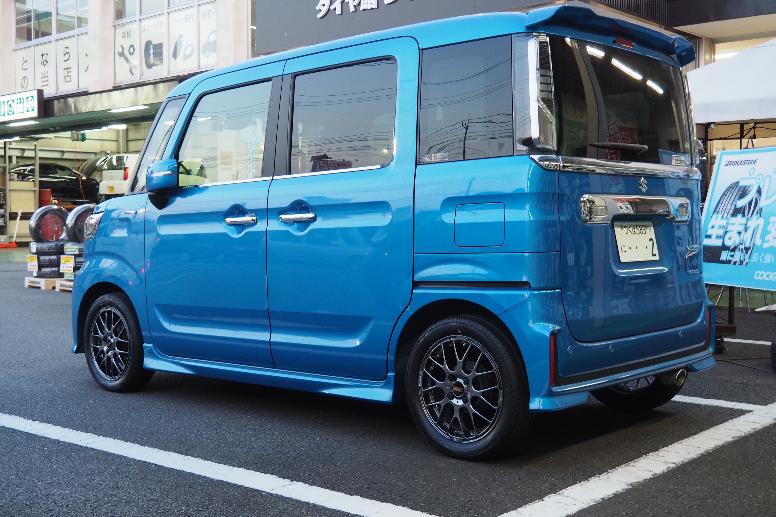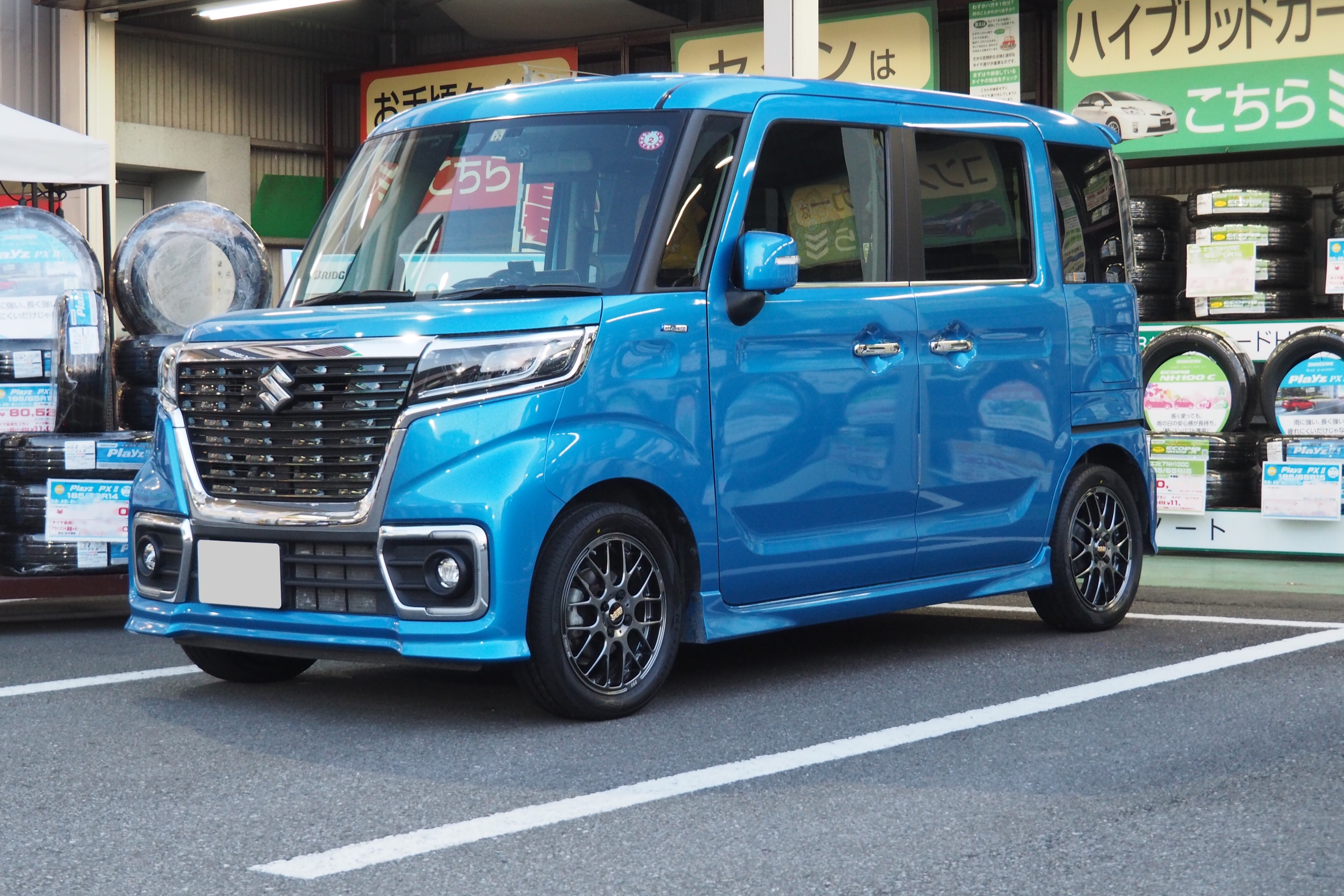 今回ご紹介させていただくのは、スペーシアカスタムにBBSのアルミホイールの取付のご紹介になります。