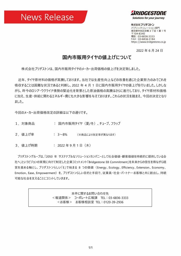 昨日、ブリヂストンのホームページからタイヤ値上げの