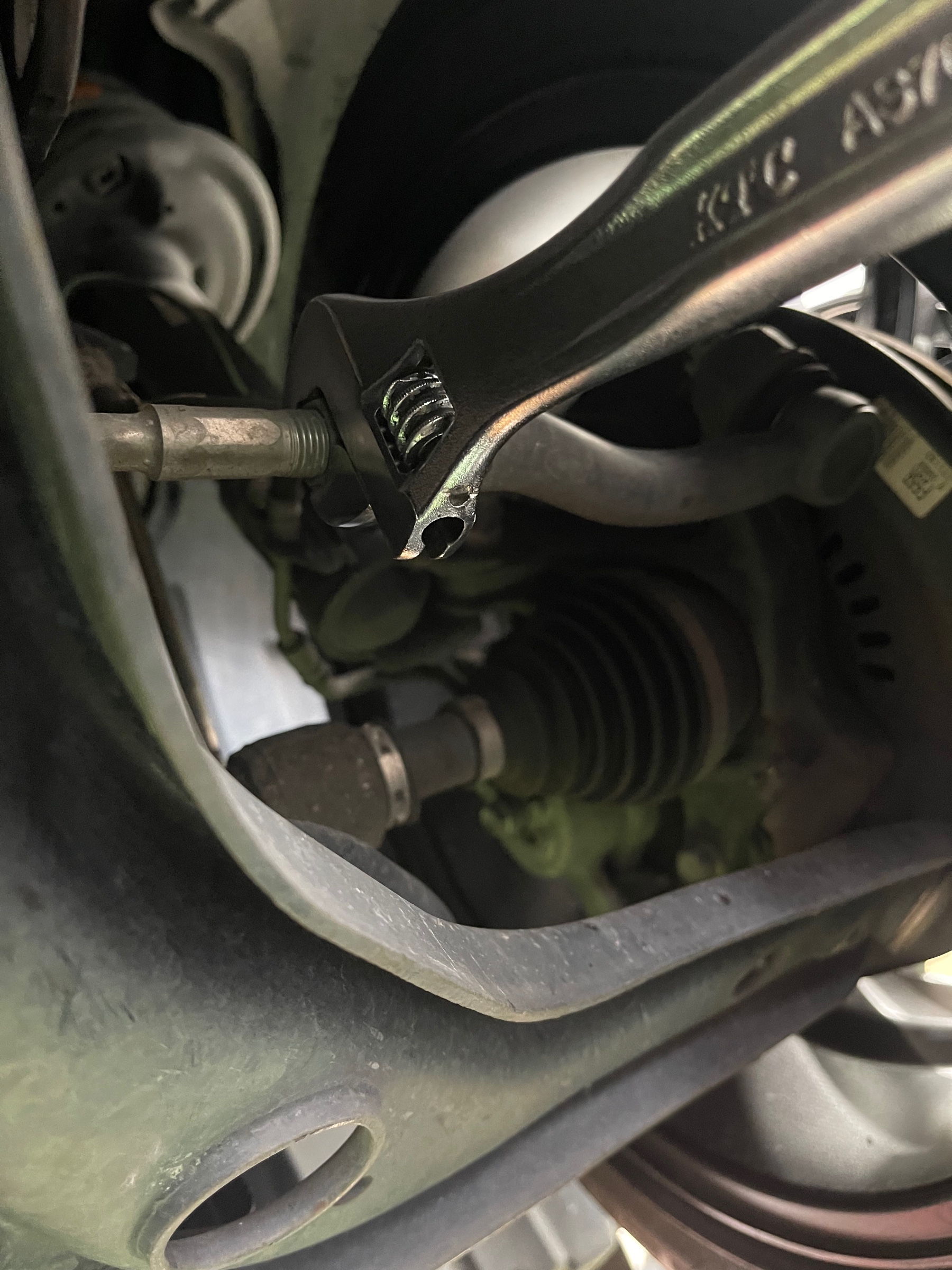 タイロッドという場所のロックナットを緩めてロッドを回して適正な位置に調整しますよー!!