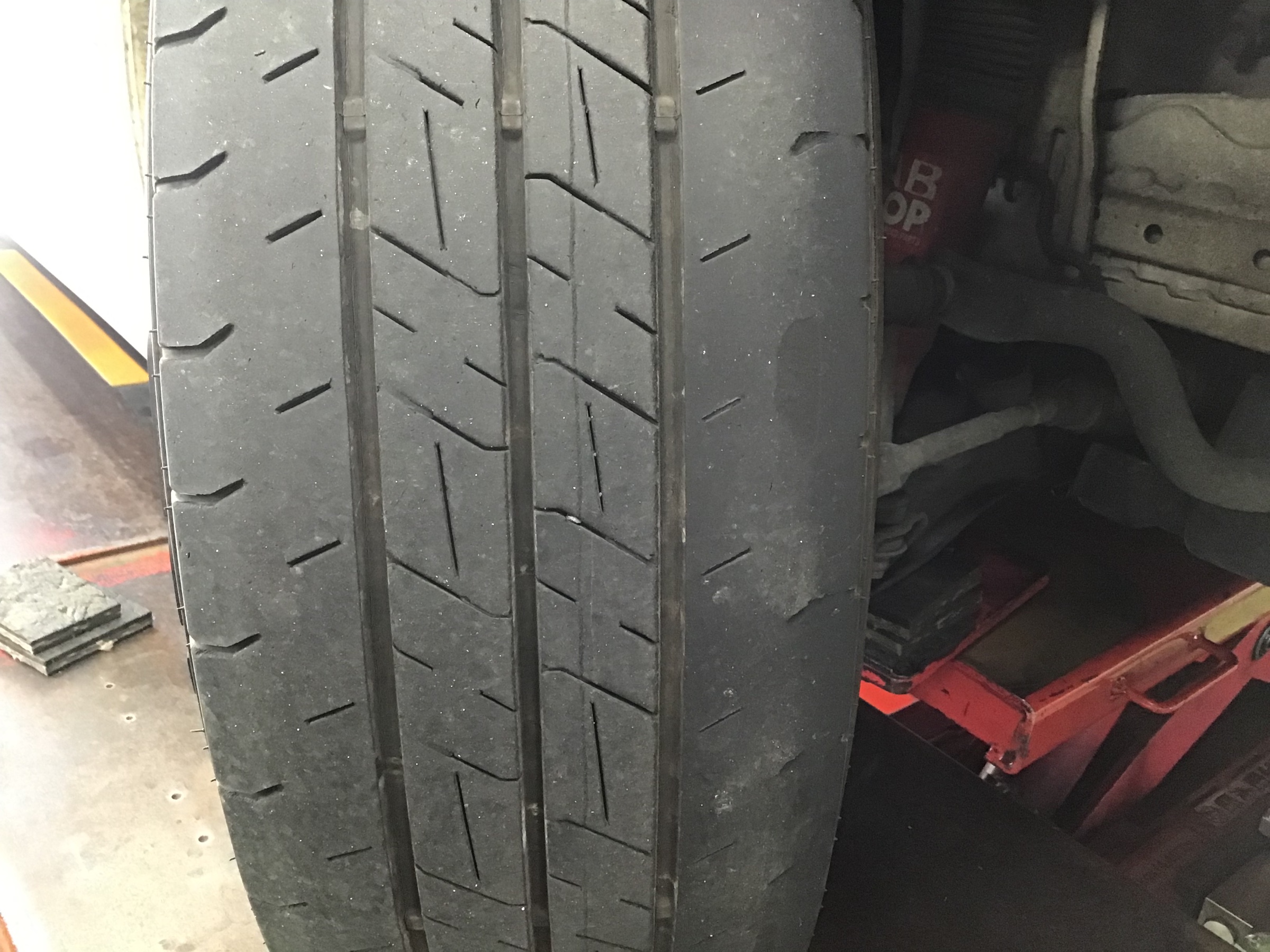 交換前のタイヤです。偏摩耗しています。