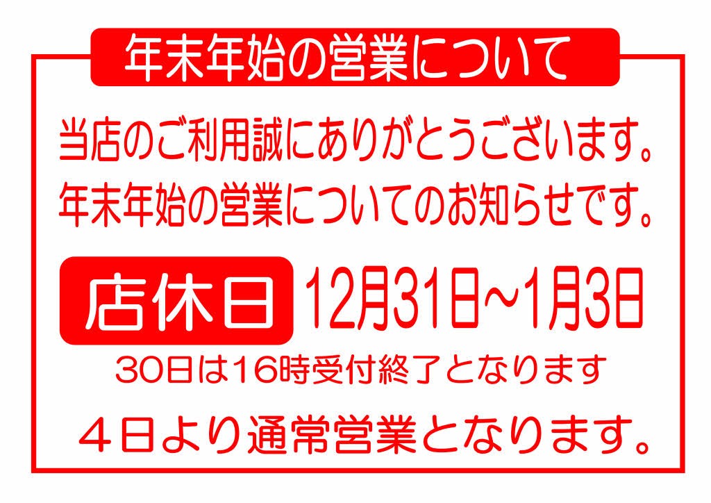 ※年末年始の営業について※ ポスト 2022年12月28日 いつも当店のホームページをご覧いただき誠にありがとうございます。 年末年始の営業についてお知らせです。 ・臨時休業日 令和4年12月31日~令和5年1月3日 4日間 4日からは通常営業となります。 お客様にはご迷惑をお掛けしますが、宜しくお願い致します。 カテゴリ:お知らせ
