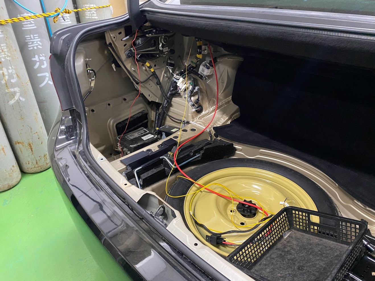 まずが電源を確保するため、エンジンルームのバッテリーからトランクまで