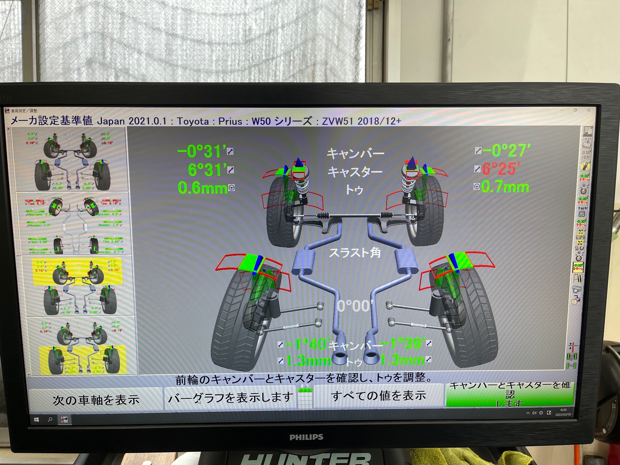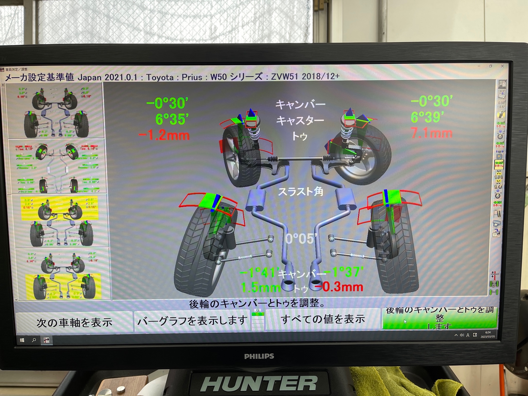 今回の型のプリウスは前後のトー調整が可能なので基準値に。