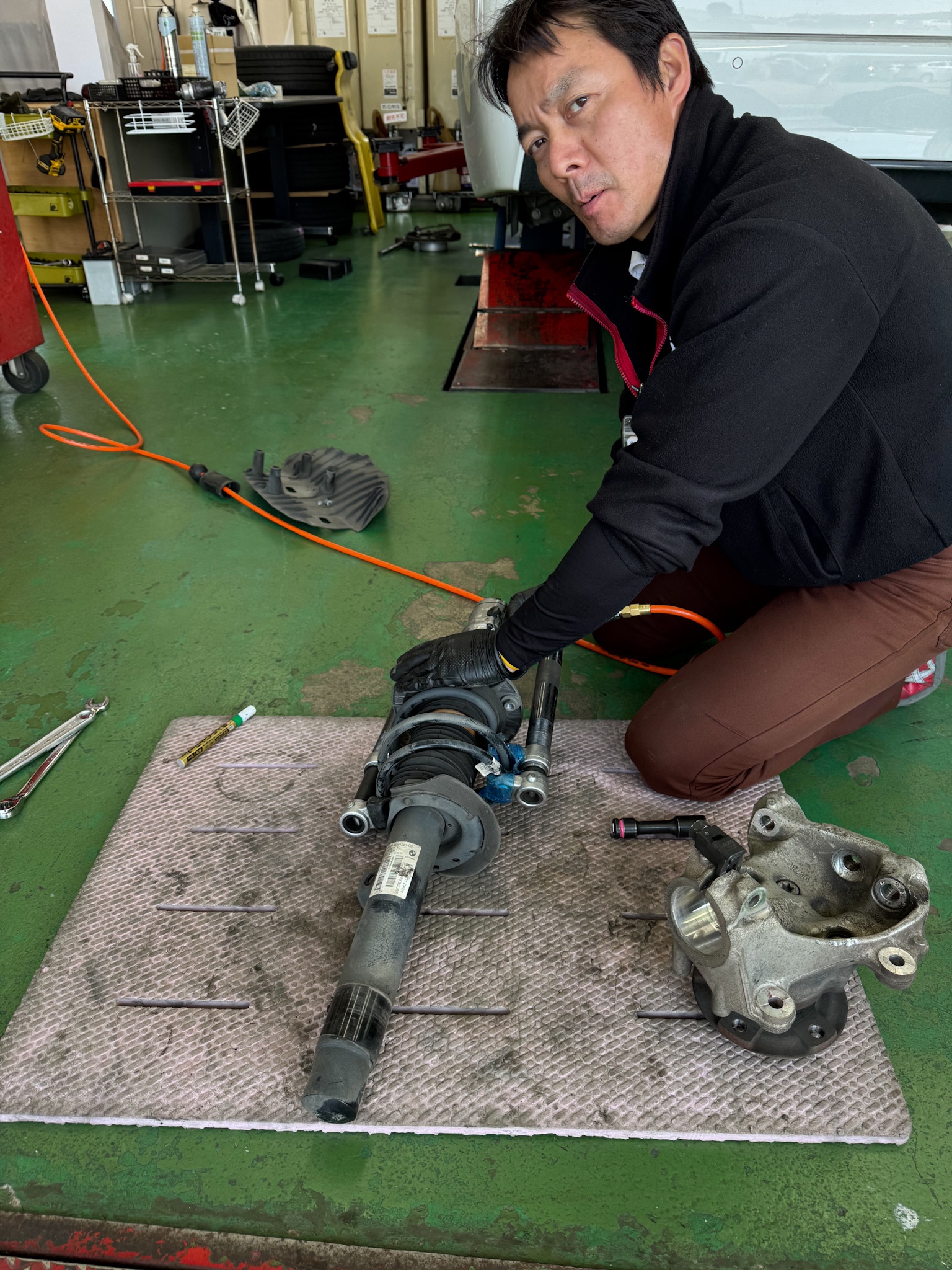 フロントショック交換中のたかせテンチョ。