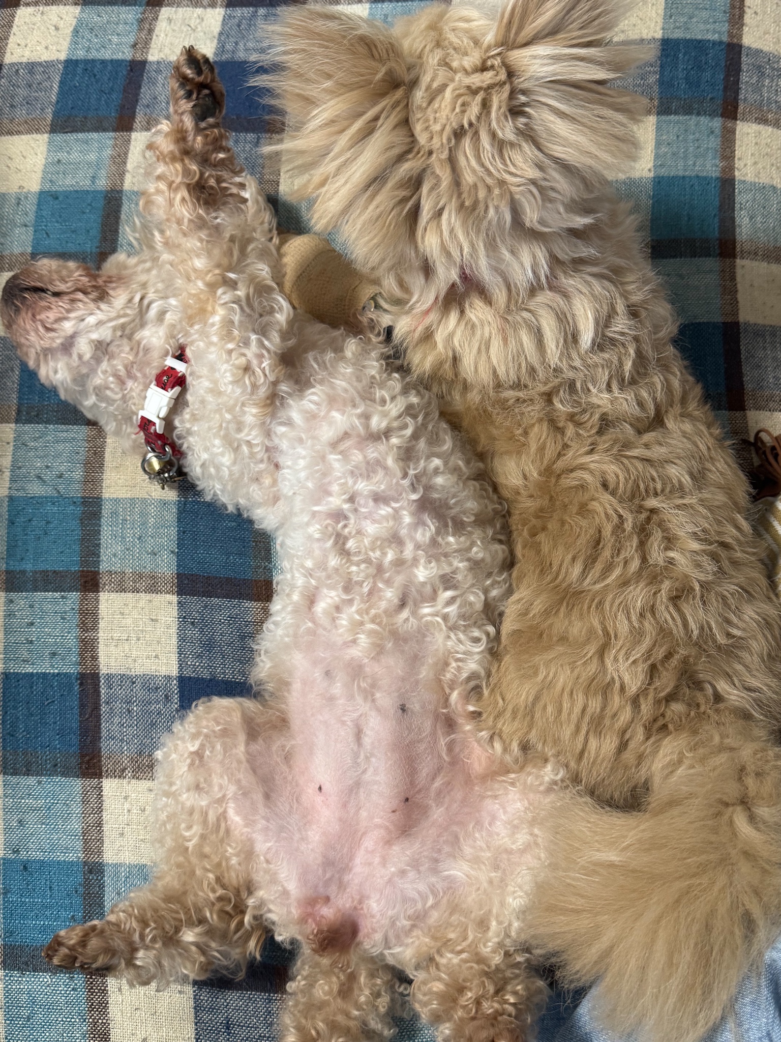 ヘソ天クネクネのつくねさんとモシャモシャのおあげさん
