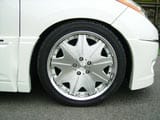 グッと引き締まったフェイス。小振りながらもリップに張り出しを持たせ、アピール度は高く、サイドステップはドアパネルと一体型の成型され、ドアと一緒に開くので、乗り降りも純正と変わりなくOK。Rは内巻きではなくストレートに切り落としたようなデザインながらもボリューム感をアピールします。