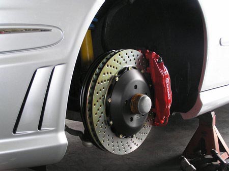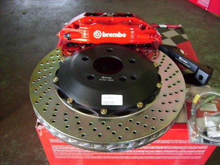 4ピストン赤/355ⅹ32/2ピース/ドリルドローターKIT。車種毎に専用設計されており、アルミ製キャリパー、専用ブレーキパッド、フローティングマウントされたドリルドもしくはスリットディスクローター、インナーベル、キャリパーブラケット、ステンレスメッシュブレーキホースで構成され、ストックのブレーキパーツと換装することにより、最新のハイパフォーマンスカーに優るとも劣らない、強靭無比のブレーキシステムを構築します。踏力にリニアに反応するあふれんばかりの剛性感。マージンたっぷりの耐フェード性。ウェットからドライ冷間時から超高温時、すべての条件下で世界最高レベルのブレーキパフォーマンスを発揮します。