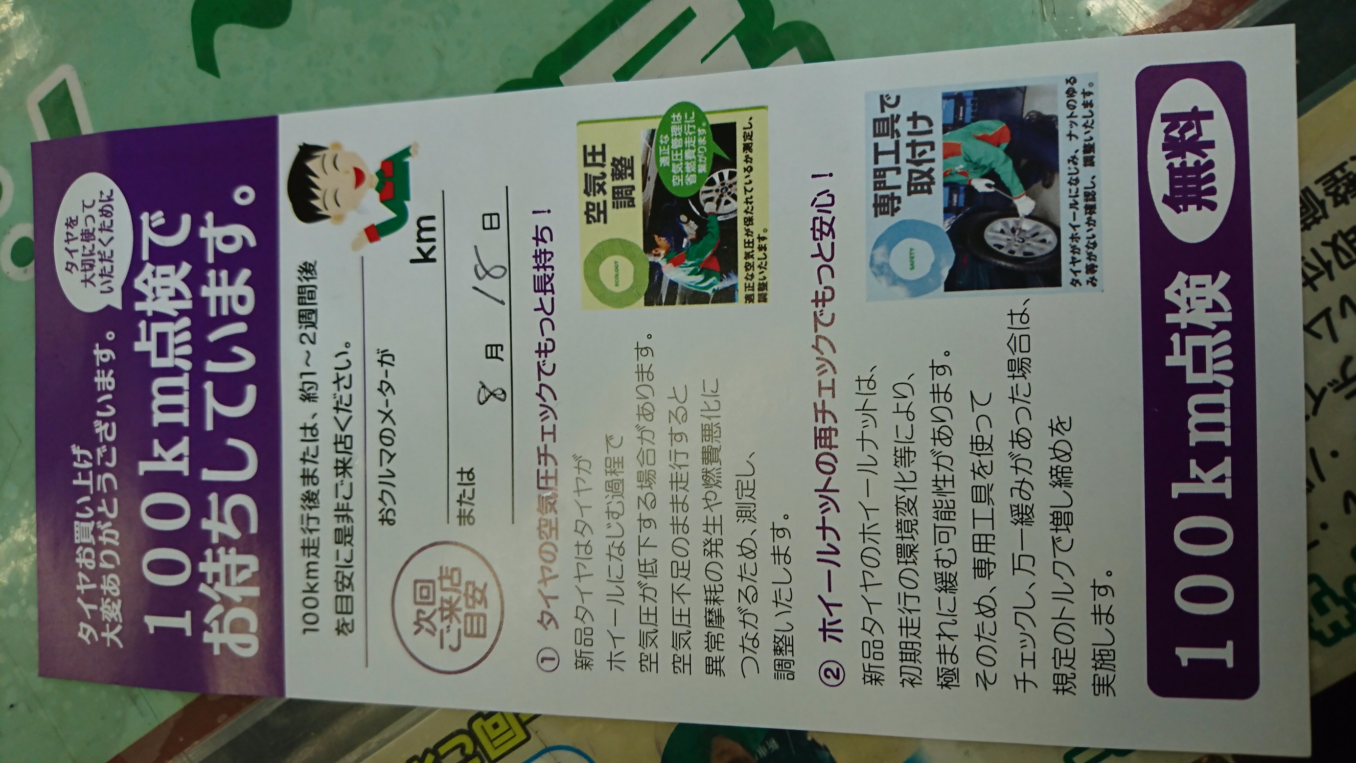 タイヤ交換されたお客様にはメンテナンスパスポートと一緒にこちらの100km点検の用紙もはいってます。